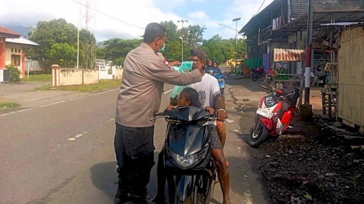 tribratanewsflorestimur.com – Polres Flores Timur, Polda NTT. Dalam upaya menjaga kesehatan masyarakat di tengah aktivitas erupsi Gunung Lewotobi yang kerap mengeluarkan abu vulkanik, Bhabinkamtibmas Desa Boru, Kecamatan Wulanggitang, AIPDA Agustinus Fay melaksanakan kegiatan pembagian masker kepada warga yang melintas, Kamis (23/04/2026) pagi, sekitar pukul 09.00 WITA di wilayah Desa Boru.